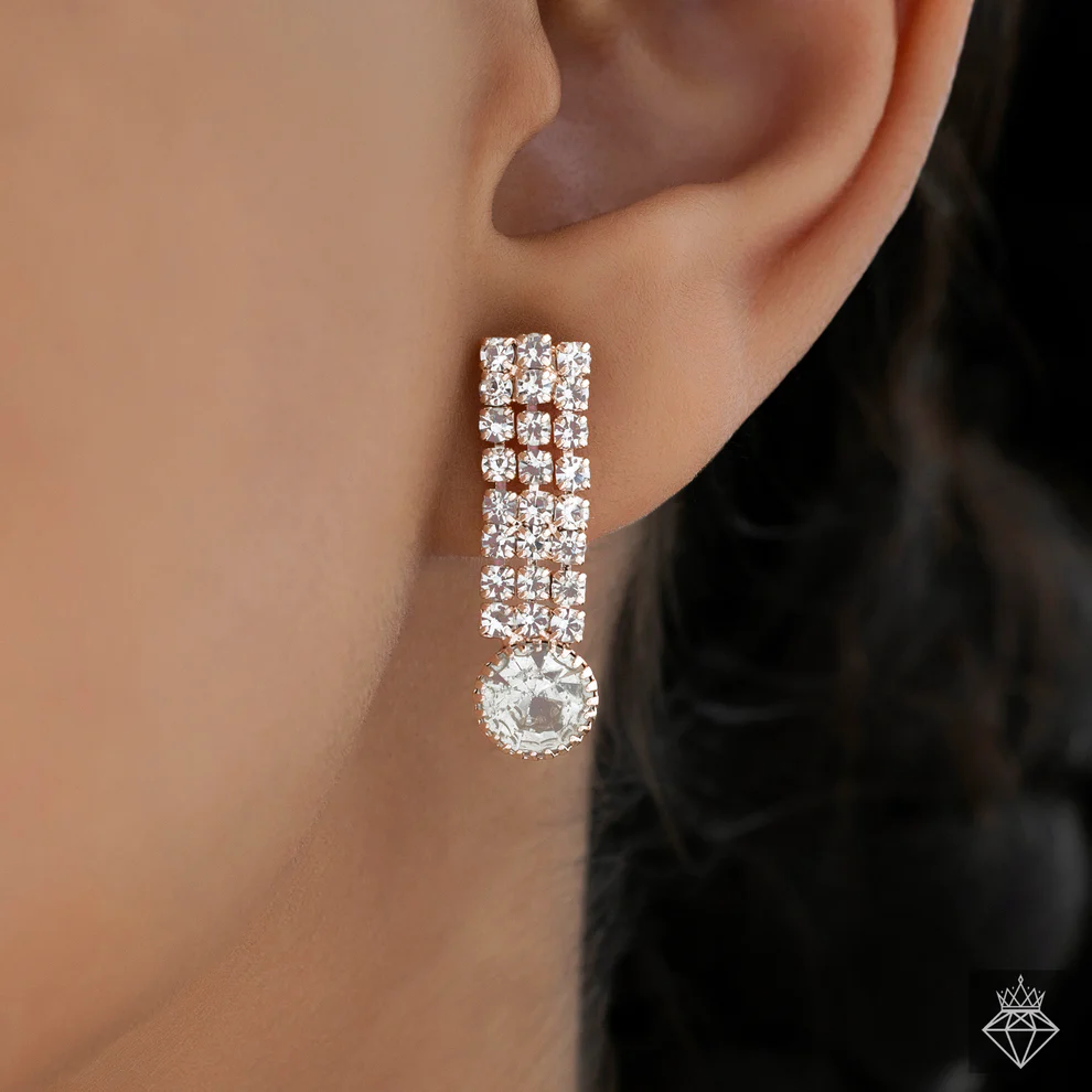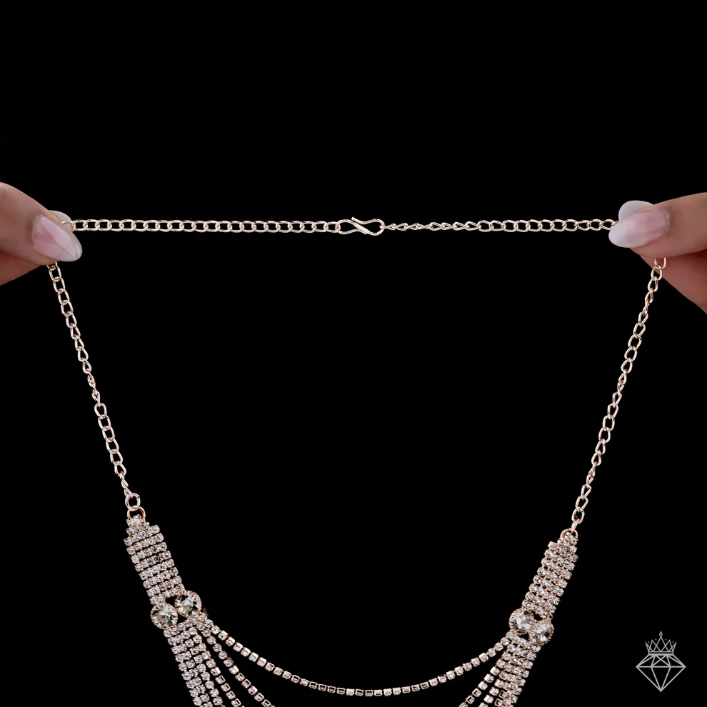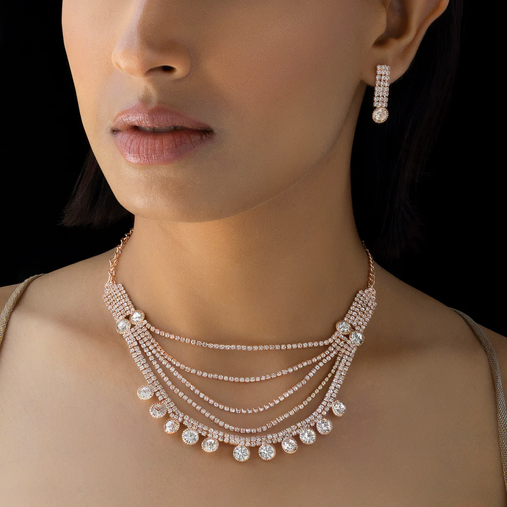 This gorgeous layered necklace set, exquisitely embellished with solitaire crystal embellishments and sparkling rhinestones, will elevate your elegance. Each layer adds a bright sparkle to the neckline and is designed to produce an elegant cascading appearance. With each movement, the solitaire crystals effortlessly catch the light, adding a polished shine. This set adds sophistication to both classic and modern ensembles, making it ideal for weddings, parties, and festive occasions. It is perfect for lengthy occasions because of its lightweight yet striking style, which guarantees comfortable wear. This necklace set radiates classic charm and luxury whether it is worn with an evening gown, a stylish dress, or ethnic clothing. In addition to being a must-have for jewelry enthusiasts, it also makes a considerate present for anybody who values fine craftsmanship and a little glitter in their accessories.